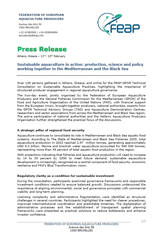 On February 11 & 12, 2026 more than 70 participants in person and around 50 online gathered in Athens for the FEAP–GFCM Technical Consultation on Sustainable Aquaculture Practices, highlighting the importance of structured producer engagement in regional aquaculture governance. The two-day event was jointly organised by the Federation of European Aquaculture Producers and the General Fisheries Commission for the Mediterranean of the Food and Agriculture Organization of the United Nations, with financial support from the European Union, and in collaboration with our member association HAPO.